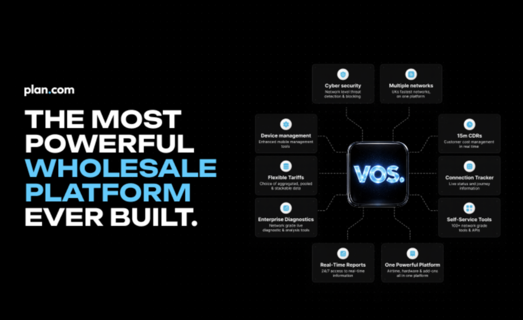 plan.com says a unified approach addresses fragmentation in the wholesale market, where partners often rely on multiple systems. Vos.plan includes multi-network access under a single account, flexible tariff structures, real-time reporting, connection tracking and service management tools, alongside hardware lifecycle management.