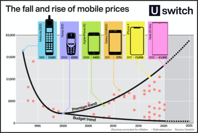 The average handset costs £355 compared to £72.50 back in 2000